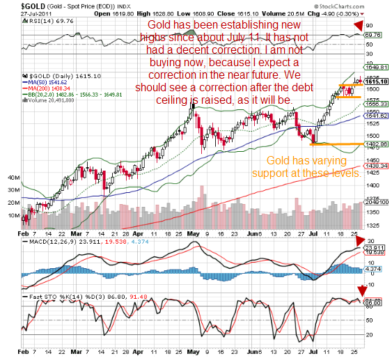 The U.S. Dollar is making a very poor showing in the face of deadlock over the debt ceiling. I am against raising the debt ceiling, but realize that Congress will raise it at the last possible moment. The political posturing and rhetoric flows in abundance, but that is all smoke and mirror arrangement. Long term the Dollar will fail to maintain the coveted reserve status with a concurrent substantial drop in purchasing power. This could happen as early as 2012, but only the Lord knows when He plans to dump the unrepentant America which was founded as a result of His providential will. Here is a look at the dollar index.